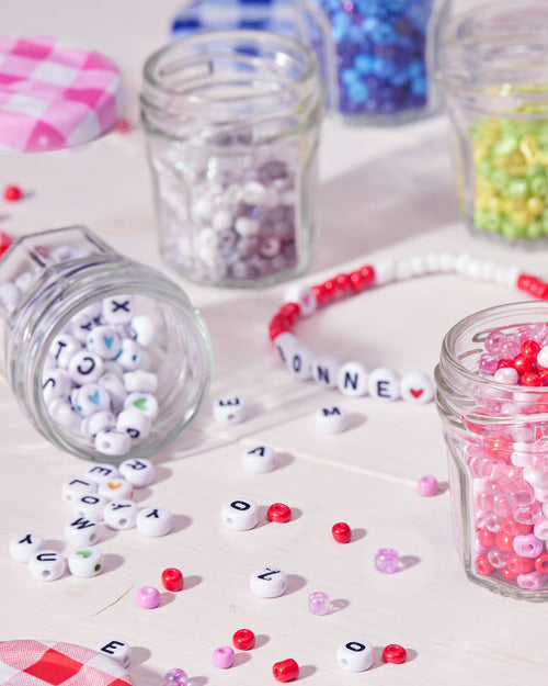 Beads, silk threads (for stringing beads), erasers, glitter, and yarn! -