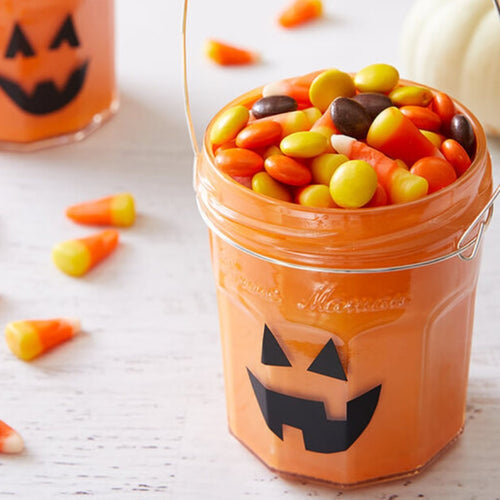 - Tip the jar over the paint bowl, pouring the leftover paint back into it and wipe the rim of the jar with a clean paper towel. Dry the jars. Once dry, spray the interior with food-safe sealant spray. Using the small sheet of black vinyl, cut out jack-o-lantern face shapes.