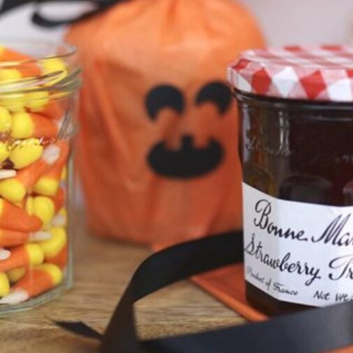 - Use hot glue to adhere the jack-o-lantern faces to the front of the jar.