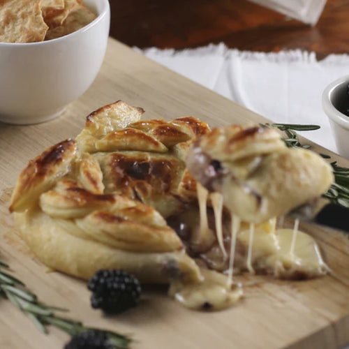 - Line a baking sheet with parchment paper. Place wrapped cheese wheel on prepared baking sheet and brush evenly with egg wash. Bake until pastry is crisp and golden brown all over, 25 to 35 mins. If you desire a more golden top, turn on the broiler for the last 1-2 mins. Let rest 5-8 mins before serving.