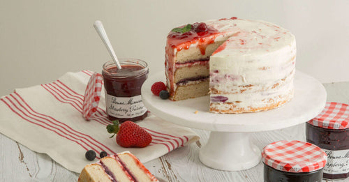 - Place a second cake layer on top of the first, and spread another thin layer of frosting on top. Next, spread the Bonne Maman Wild Blueberry Preserves to the edge. Top with the third cake, a thin layer of frosting, and this time use the Bonne Maman Raspberry Preserves for the filling. Place the final cake layer on the top, and spread the remaining frosting in a thin layer over the top and sides of the cake. Run your spatula around the edge of the cake to scrape away any excess frosting.