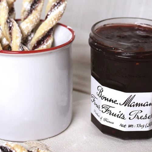 - Unfold the puff pastry sheet and roll the dough to at least 24” wide. Dough should be about 1/16” thick or even a bit thinner. Cut in half and spread the preserves on one side.