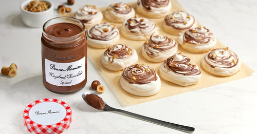 - Using a toothpick or knife tip, stir in approximately 1 tablespoon Bonne Maman® Hazelnut Chocolate Spread into each cookie—swirling quickly, as to not distress the integrity of the meringue.