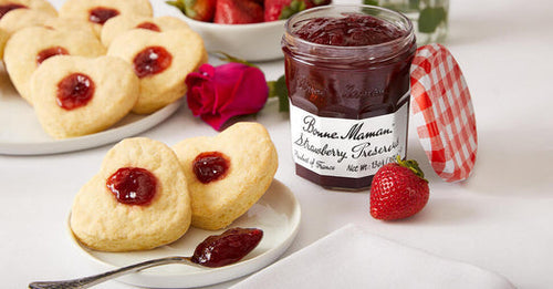 - Roll out your dough to 1/2″ to 3/4″ thickness and cut into hearts. Press an indent in the middle of each scone with your thumb, fill with desired amount of Bonne Maman Strawberry Preserves, and bake until lightly browned (check at 10 minutes, it could take as long as 15.)