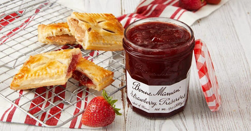 - Thaw pie crust and roll flat. Using a knife, trim four rectangles out of the crust, approximately 3 inches wide by 4 inches tall. On one rectangle, spread the Creamy Nut Butter in the center, leaving approximately a half inch on each side. On another rectangle, spread the Bonne Maman Strawberry Preserves in the center, leaving the same amount of space around the edges.