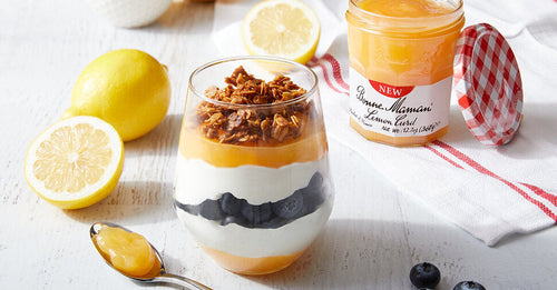 - Layer together the Bonne Maman Lemon Curd, yogurt, blueberries, and caramelized oats in 4 mason jars, coupes, or ramekins.