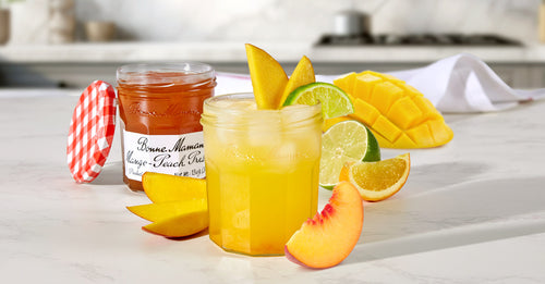 - Add orange juice, rum, lime juice and ice to nearly empty Bonne Maman Mango-Peach Preserves jar.