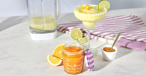 - Add ice, lime juice, fruit spread, syrup, and zest to blender.