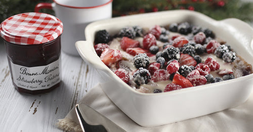 - Grease an 8×8” baking dish, fill with sliced pre-made croissant dough and mixed berries. Set aside.