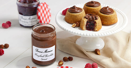 - Allow to cool completely and remove from tin. Flip over on a baking rack and dollop each cake with a swirl of Bonne Maman Hazelnut Chocolate Spread.