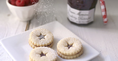 - Spread Bonne Maman Raspberry Preserves on the flat side of each solid cookie. Press both cookies sides together with the raspberry preserves in the middle. Dust with powdered sugar on the top. Serve.