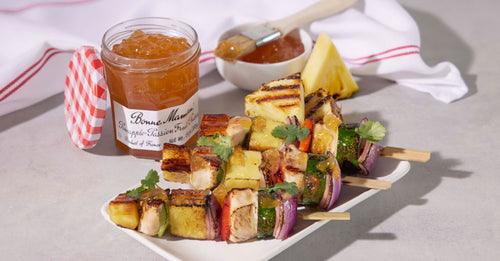 - Grill, rotating the skewers and brushing repeatedly with Bonne Maman® Pineapple-Passion Fruit Preserves until all sides have developed a bit of char. About 7-9 minutes.