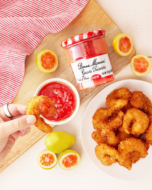 Now, make the dipping sauce. Mix the Bonne Maman Guava Preserves and the other ingredients together in a small saucepan, and heat until the honey dissolves. Allow it to cool, then add it into a bowl for dipping!