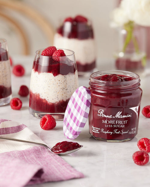 Now, fill the top part of each jar with the remaining Bonne Maman More Fruit, Less Sugar Raspberry Fruit Spread.